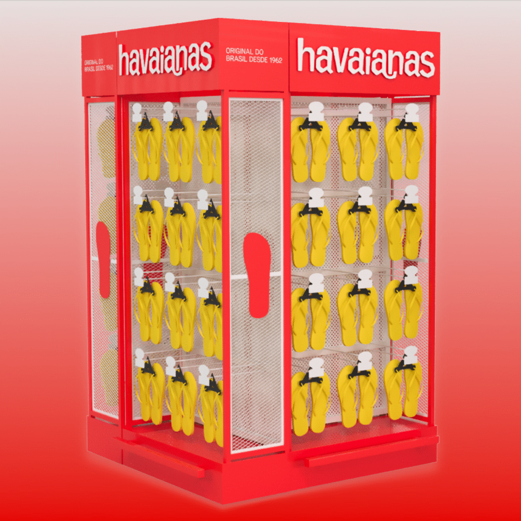 RESULTADOS: Os displays feitos de metal deixaram os produtos Havaianas ainda mais destacados, gerando aumento de out e experimentação dos consumidores, tornando-se um display perene.